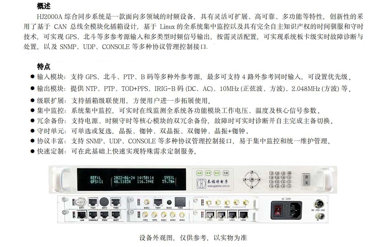 • HJ2000A 綜合同步系統是一款面向多領域的時頻設備,具有靈活可擴展、高可靠、多功能等特性,創新性的采用了基于CAN總線全模塊化插箱設計,基于Linux 的全系統集中監控以及具有完全自主知識產權的時間馴服和守時技術,可實現 GPS、北斗等多參考源輸入和多類型時頻信號輸出,按需靈活配置,可實現系統板卡級實時故障診斷與處置,以及 SNMP、UDP、CONSOLE 等多種協議管理控制接口,可廣泛應用于...